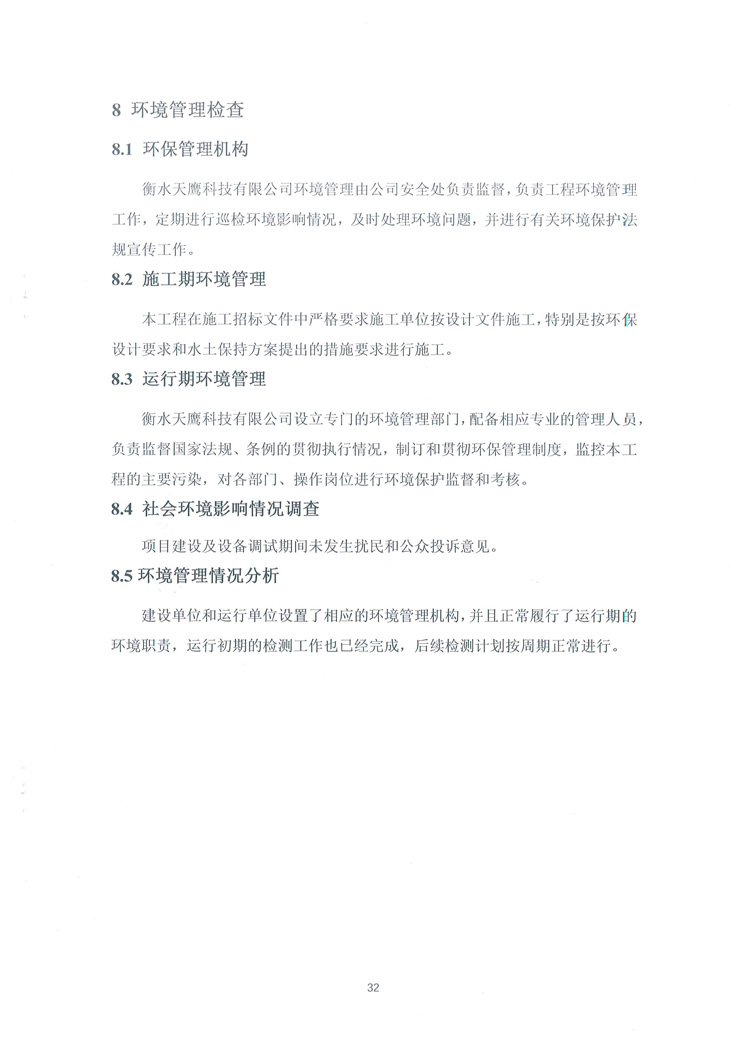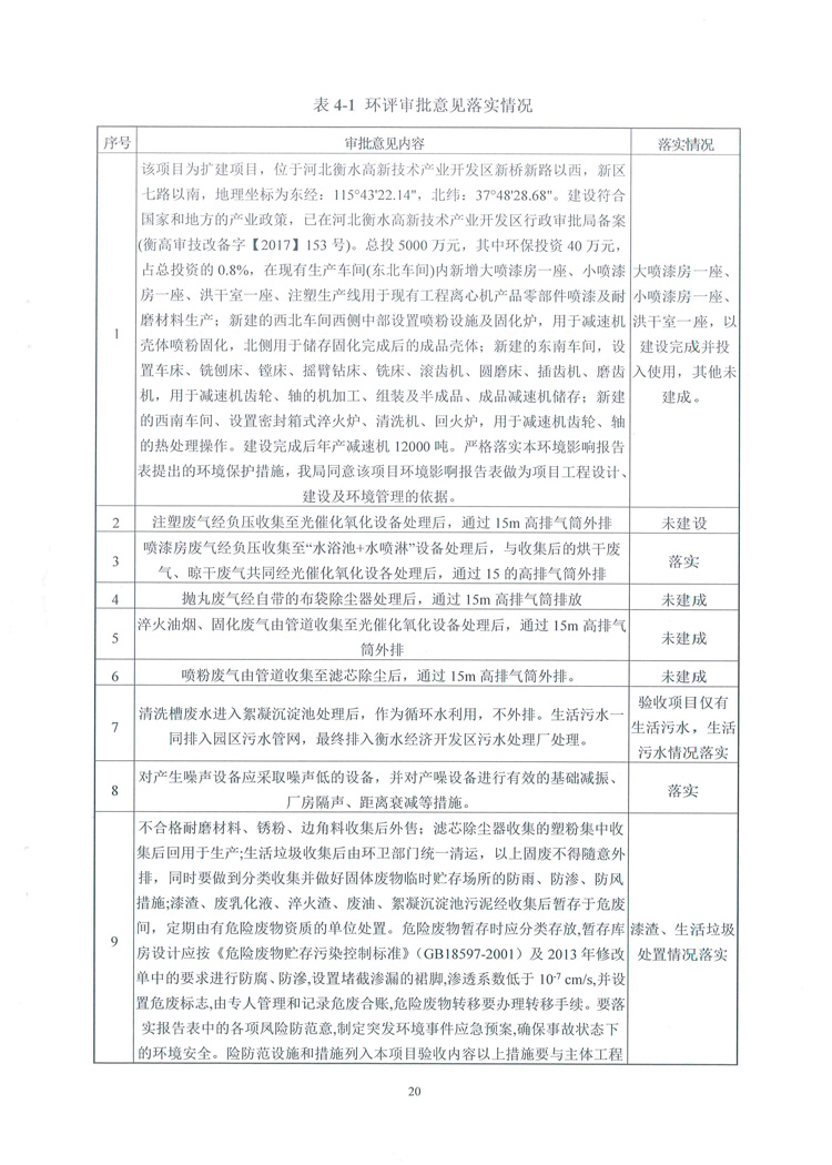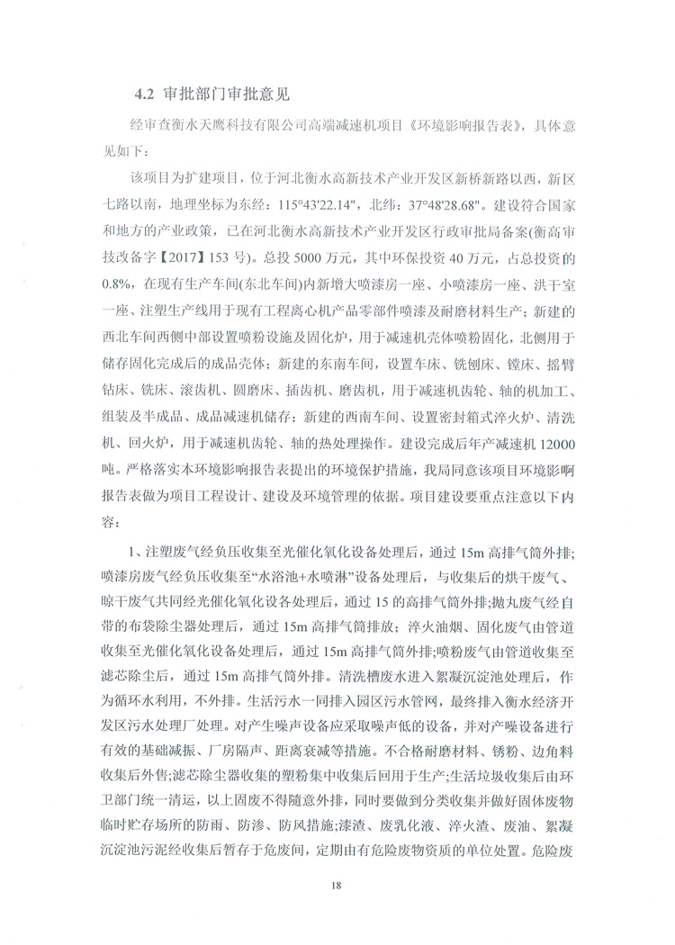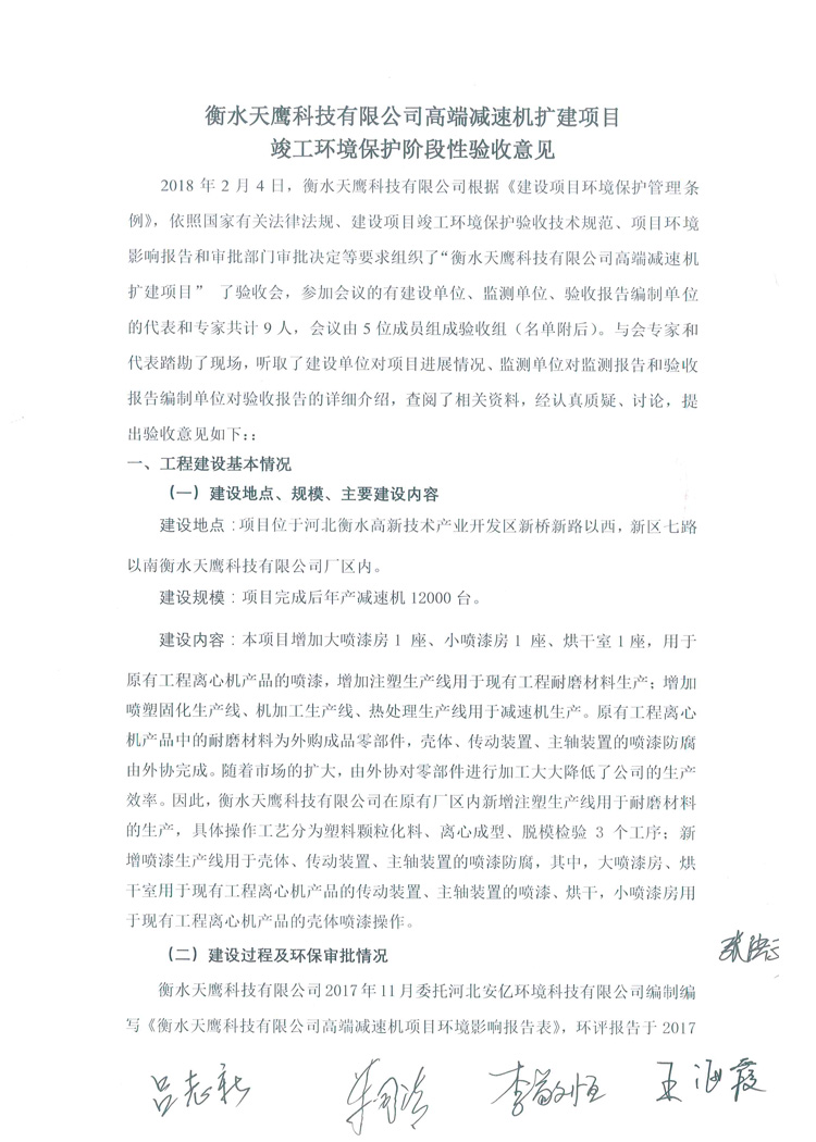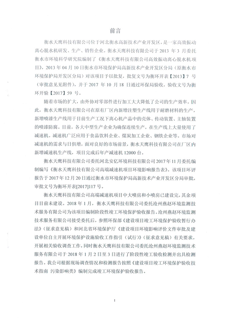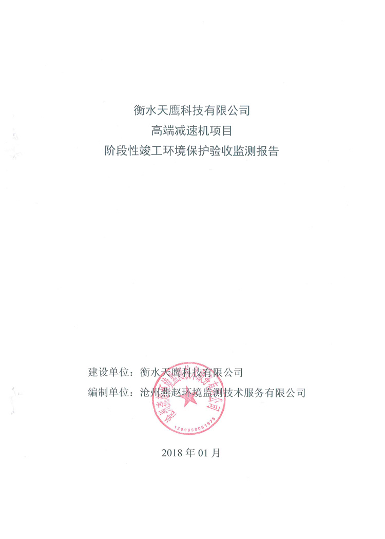 喜讯:衡水天鹰科技有限公司高端减速机项目竣工环境保护验收监测通过,现将项目阶段性竣工环境验收检测报告和验收意见公示如下: