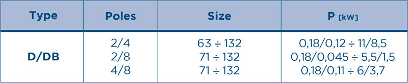 可以提供符合 IEC 国际标准的三相双极电机,可选 063 至 132 的各种规格,提供 B5 和 B14 法兰型和 B3 支脚型。这些产品可采用双极性形式(2-4、2-8 和 4-8 极),并提供交流或直流断路器。