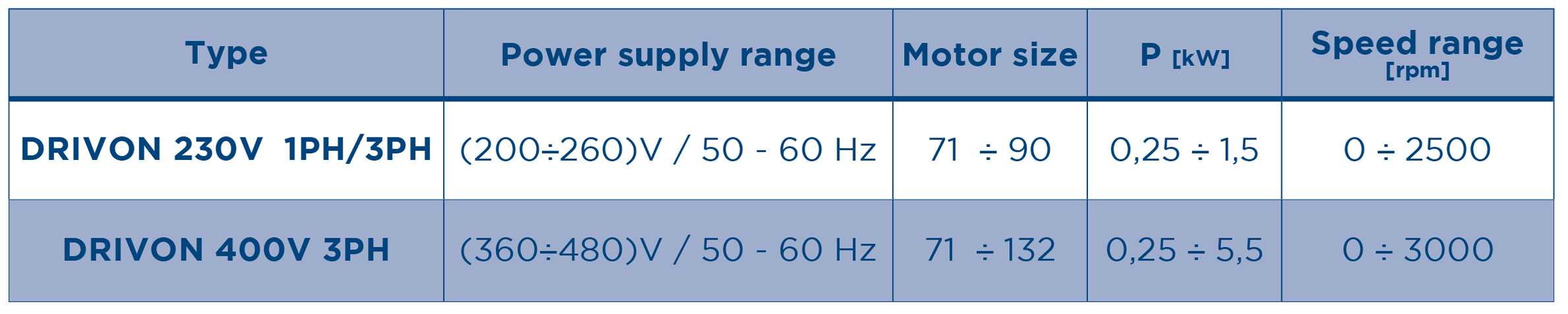 考虑到供电情况的极其不均衡性和变动性,Drivon 还具有单/三相版本(200 -260 V / 47 -63 Hz)(电机功率在 0.25 和 1.5 kW 之间),以及三相版本(360 - 480 V / 47 -63 Hz)(电机功率在 0.25 到 5.5kW 之间)。
