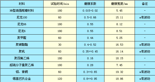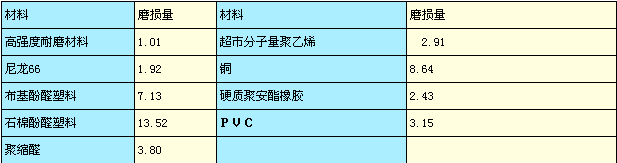 试验条件:温度20±2℃ 湿度:60±5% 磨损 cs-17 荷重9.8N 转速3000r/min *磨损量是以高强耐磨材料磨损量为1的磨损体积比